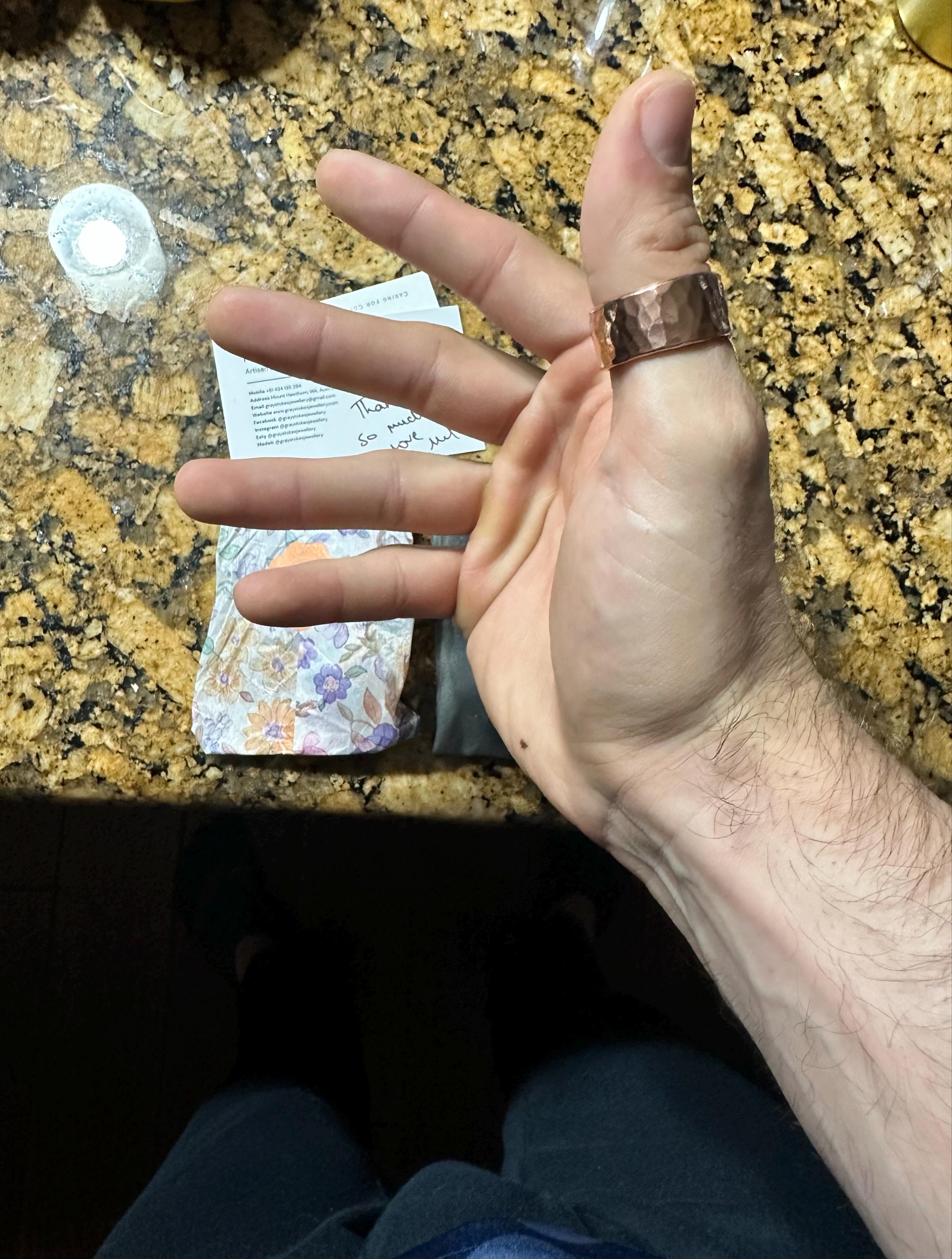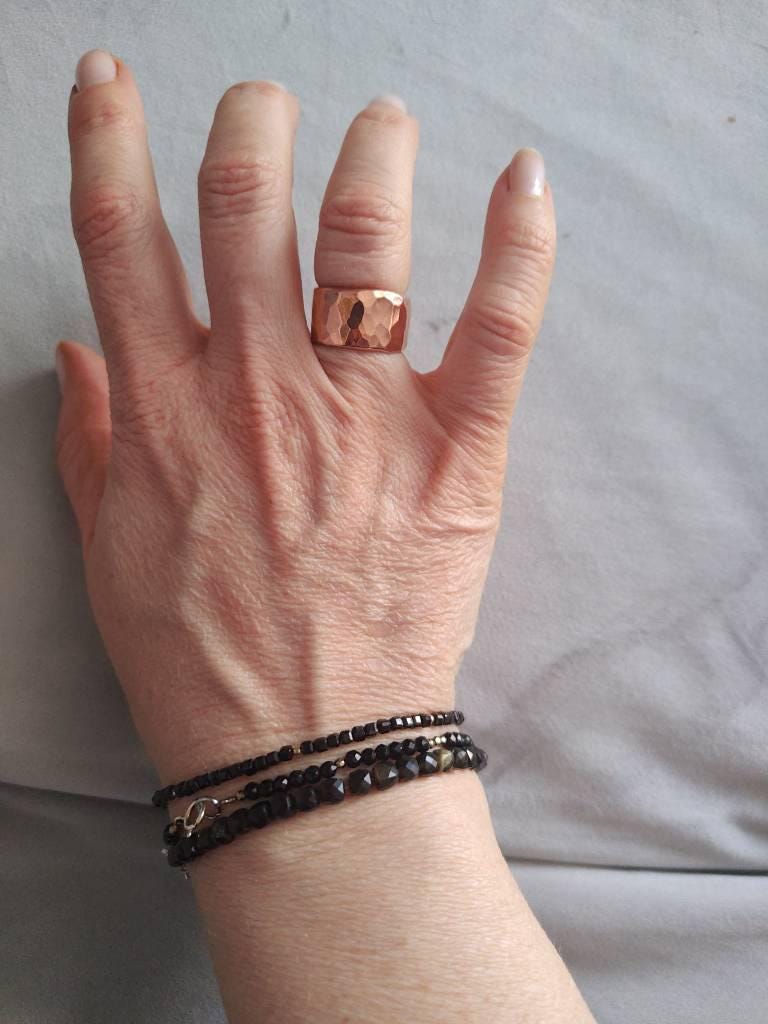 Wide solid copper hammered ring.