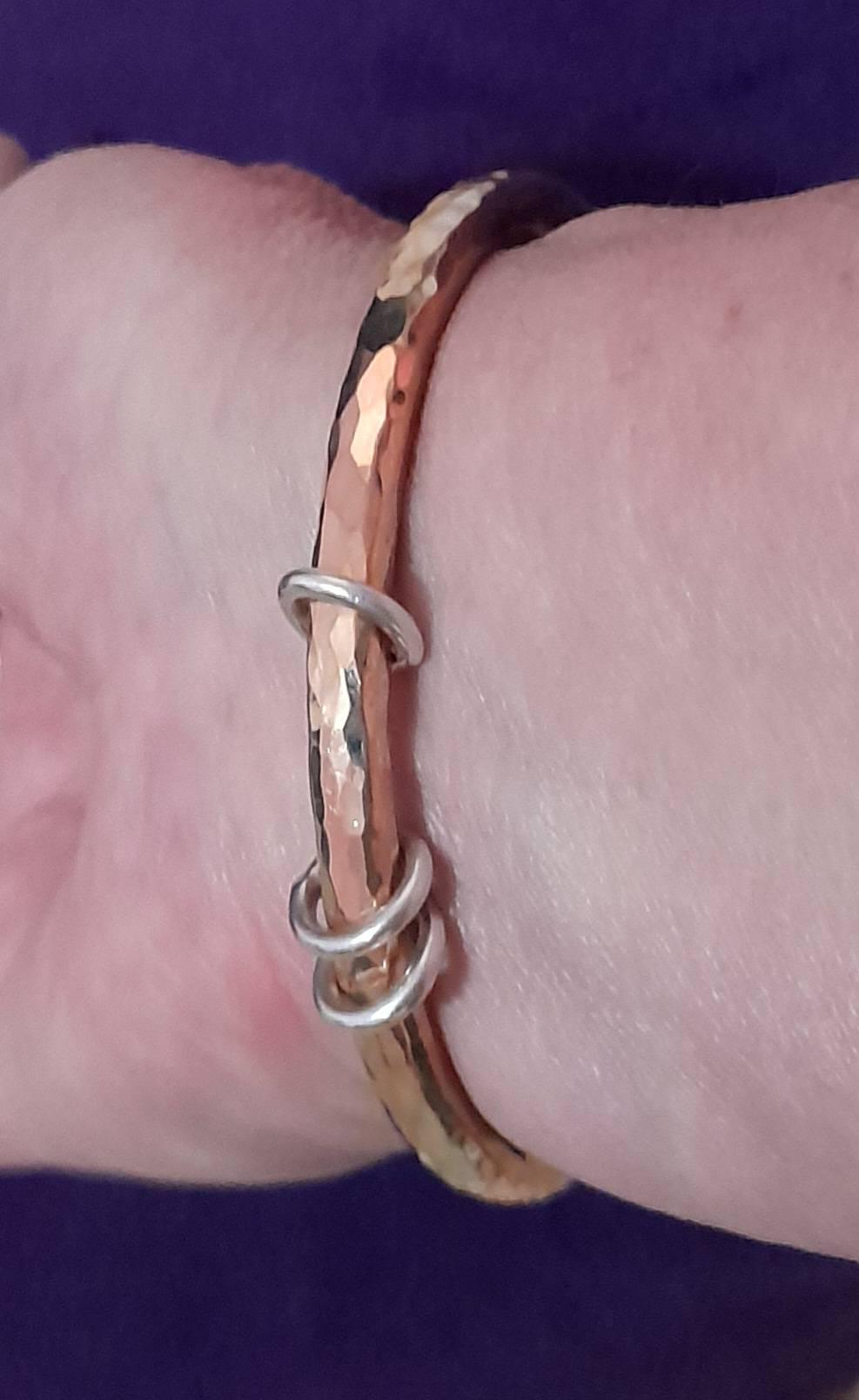 Hammered, very heavy bronze bangle. Made with 5.1mm antiqued, gold-coloured bronze, it has 3 Sterling silver links, although more can be added.