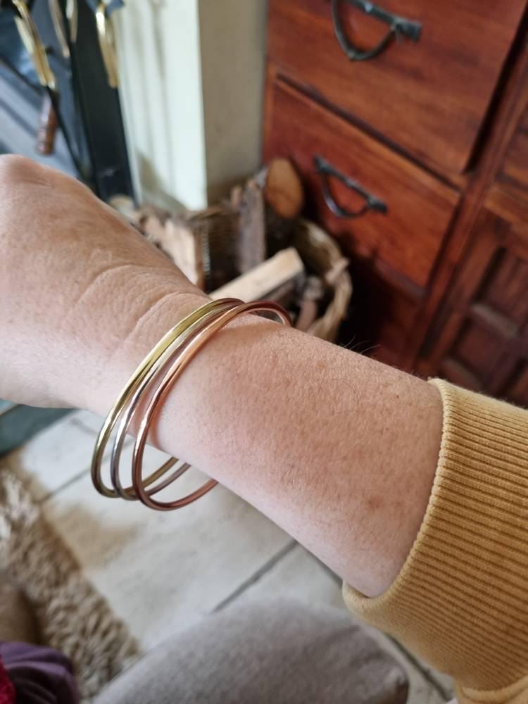 Set of three stacking bangles in hammered 925 sterling silver (2.5mm), copper (3mm) and brass (3mm).