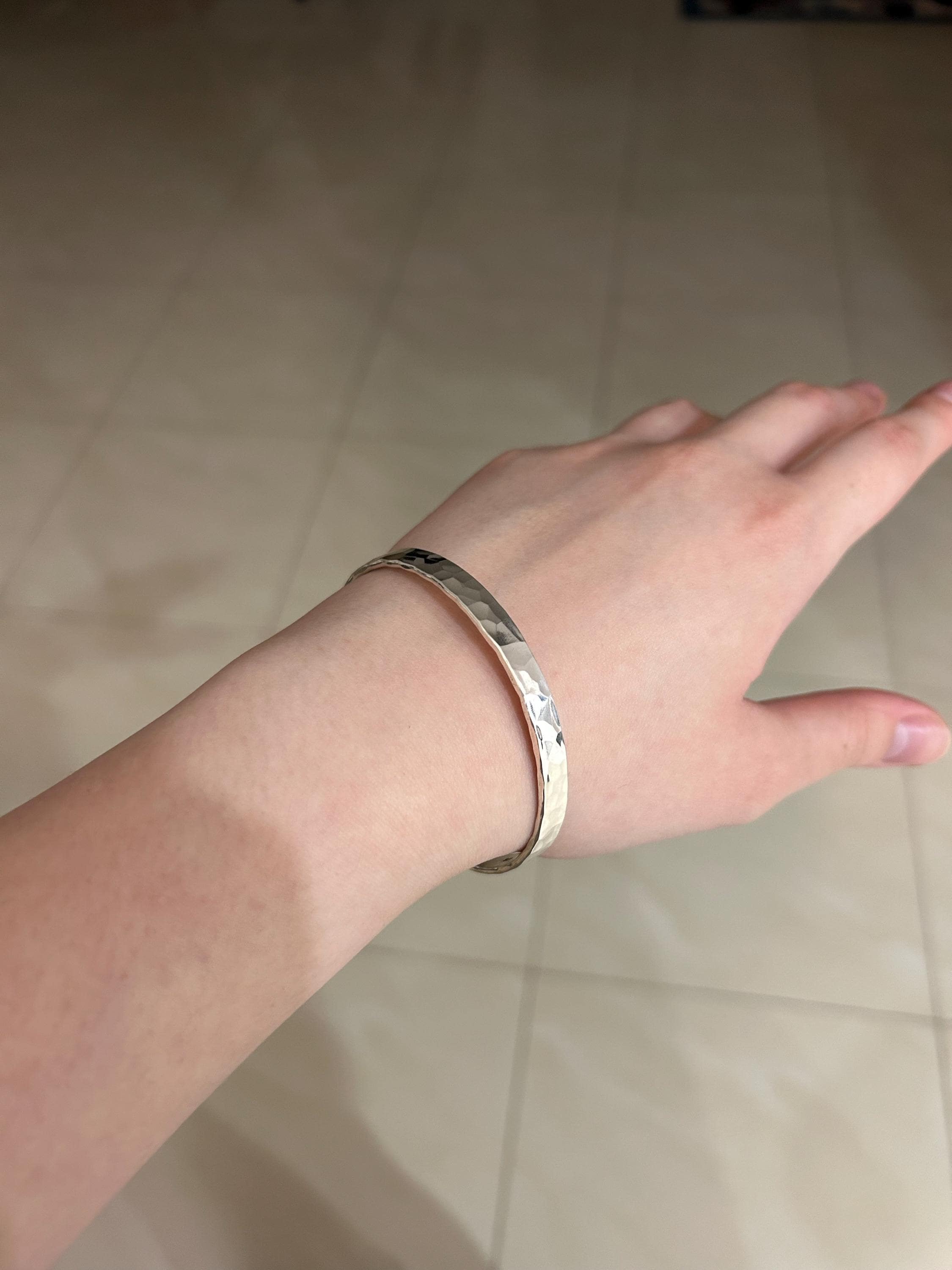 Wide, heavy solid sterling silver bangle, handmade from rolled 5mm silver wire and hammered to create a beautiful eye-catching finish.